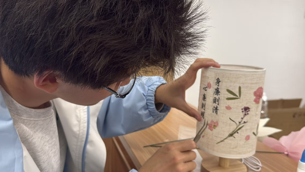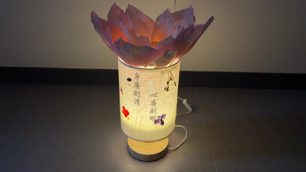 活动现场氛围专注而温馨,参与者们全身心投入手工创作,在劳动实践中感受创造之美。从皱纹纸的裁剪、莲花花瓣的塑形,到灯座的组装、干花的点缀,每一个步骤都细致认真。莲花“出淤泥而不染”的高洁品格,台灯“点亮初心、照亮廉途”的信念隐喻,在指尖流转中逐渐具象化。大家还在清廉寄语卡上,写下对廉洁的深刻感悟与未来的生活准则,让廉洁精神与美育熏陶、劳动体验深度融合,真正融入思想、扎根心底。