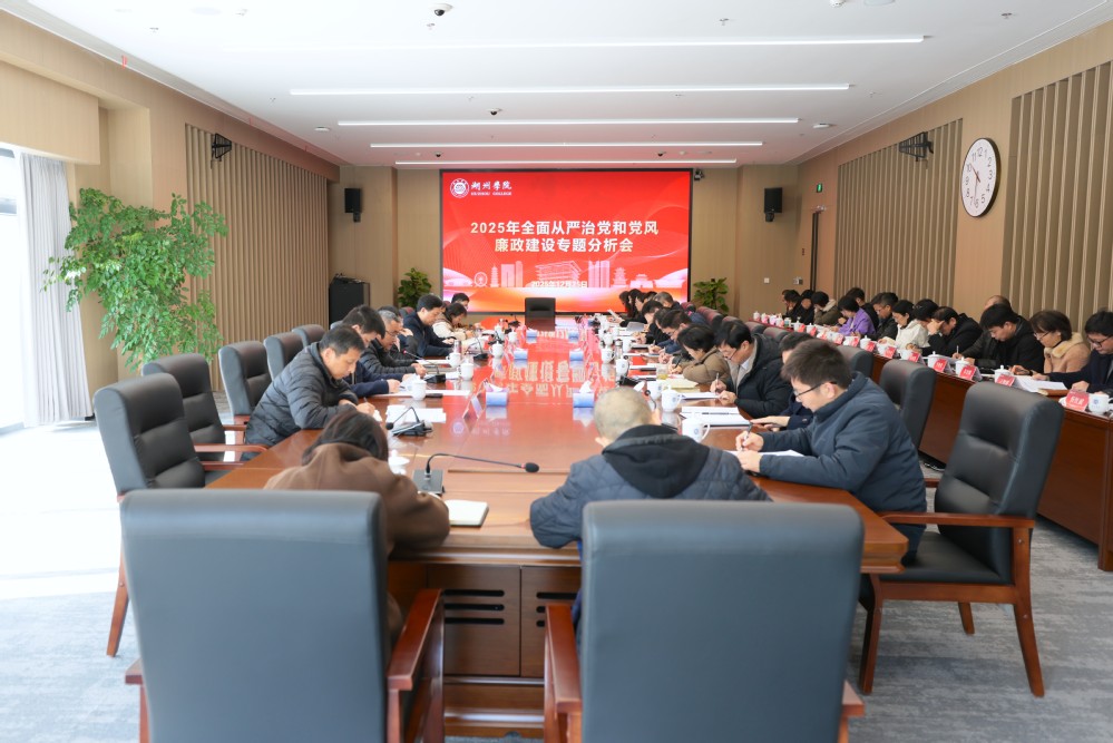 会议指出,2025年,校党委深入学习贯彻习近平新时代中国特色社会主义思想特别是习近平总书记关于党的自我革命的重要思想,认真学习贯彻党的二十大、二十届三中、四中全会精神,坚定拥护“两个确立”、坚决做到“两个维护”,按照二十届中央纪委四次全会、省市纪委全会的部署要求,认真履行全面从严治党主体责任,推动健全全面从严治党体系。一是坚持以政治建设为统领,纵深推进政治监督具体化、精准化、常态化;二是坚持严的基调、严的举措、严的氛围,持续加大正风肃纪反腐力度;三是坚持教育在先、预防在前,不断擦亮廉洁教育湖院品牌;四是坚持提升饱满度、浸润度、辨识度,全域深化清廉学校建设;五是坚持纪检监察工作规范化法治化正规化建设,切实增强纪检监察工作质效。我校全面从严治党和党风廉政建设各项工作扎实有序、稳步推进,但也要清醒认识到,当前党风廉政建设和反腐败斗争形势依然严峻复杂,任务依然艰巨繁重,学校在推进全面从严治党和党风廉政建设中还存在一些薄弱环节,需要引起高度重视并采取切实措施认真加以解决。
